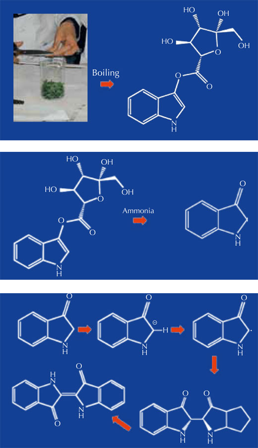 Lower-quality indigo can also be extracted from certain plants, and this technique actually pre-dates the Phoenicians’ snail-derived dye. In India, methods of extracting indigo from the ‘true indigo’ shrub Indigofera tinctoria were known before 2000 BC. In Europe, the dye was extracted from woad (Isatis tinctoria). Although these two plants contain different precursors, indican in true indigo and isatan B in woad (table 1 and figure 2), they both ultimately yield the same dye – indigo.
