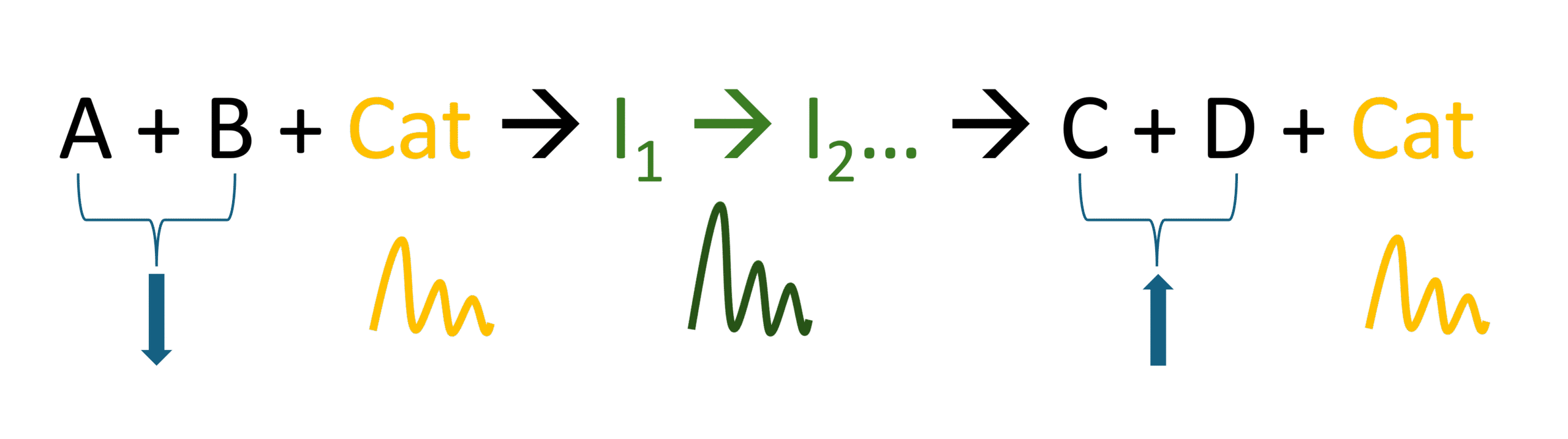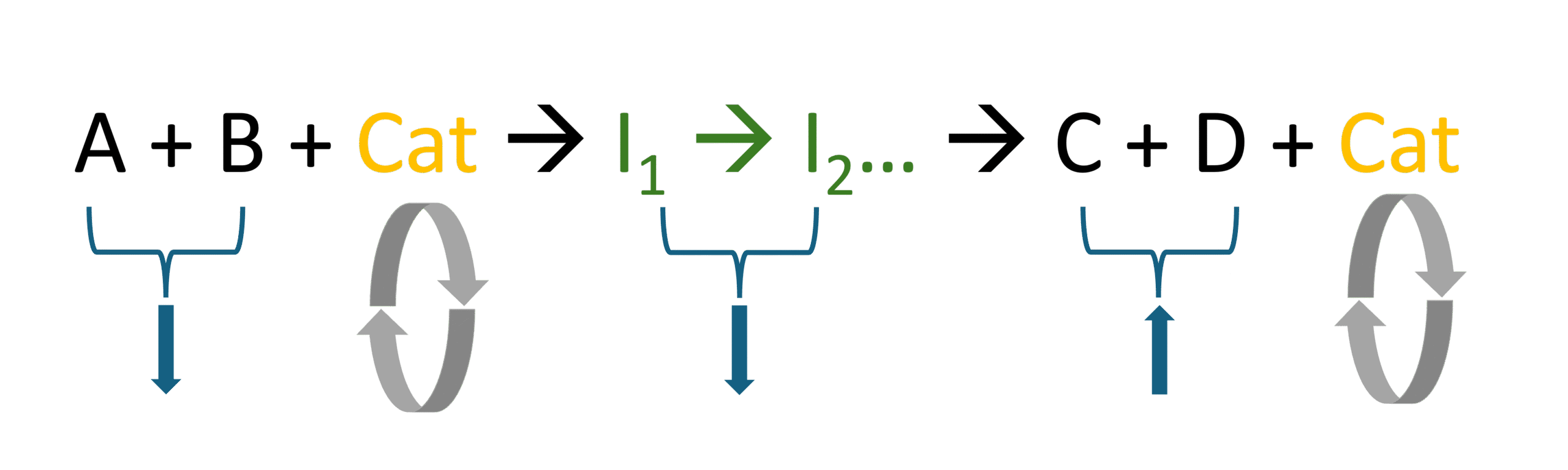 Figure 1 shows an example of a typical catalysed chemical reaction with intermediate chemical species. The concentration of the reagents (A and B) and the intermediate chemical species (I1, I2, etc.) decreases continuously over time (downward-pointing arrows), while the concentration of the products (C and D) increases continuously over time (upward-pointing arrows). The catalyst acts as both a reactant and product, and the circular arrows indicate that it reforms at each reaction cycle.