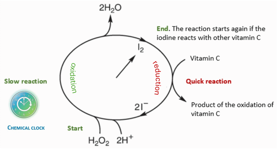 Figure 4: An overview of the reactions involved in the experiment is shown. In the quick reaction, vitamin C reduces iodine, whereas in the slow reaction, the iodide ion is oxidised to elemental iodine. The cycle begins with the addition of iodine (at the point indicated by the arrow) and ends at the same point, when the iodine is reformed. The chemical clock can be observed during the slow reaction.