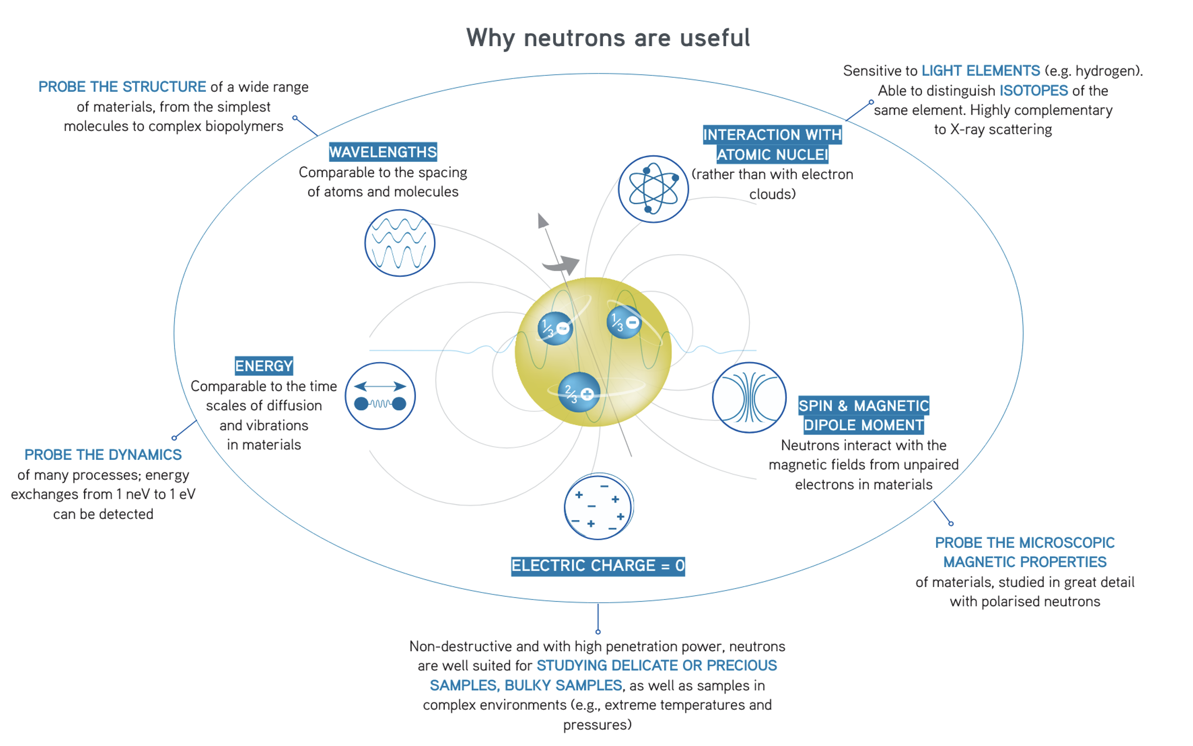 Although neutrons are electrically neutral, they are far from boring. Their exciting story begins with their discovery by James Chadwick in 1932. As time went on, researchers realised that neutrons feature several characteristics that make them valuable probe particles for studying the world around us at the atomic level.[1]