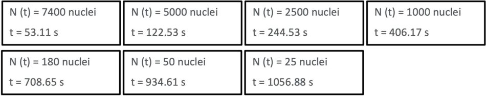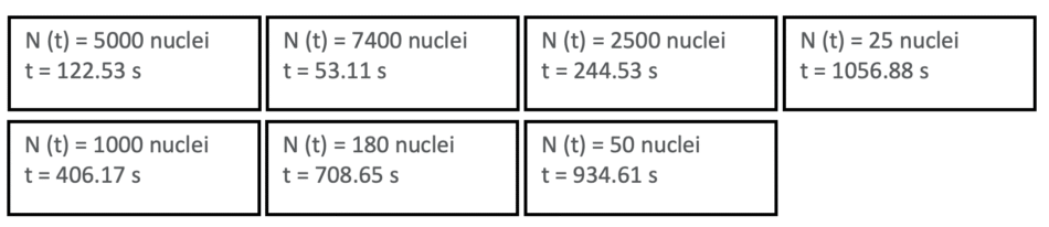 By arranging the ‘snapshot’ cards in order of increasing time values, we can see that the population of undecayed nuclei decreases exponentially over time: