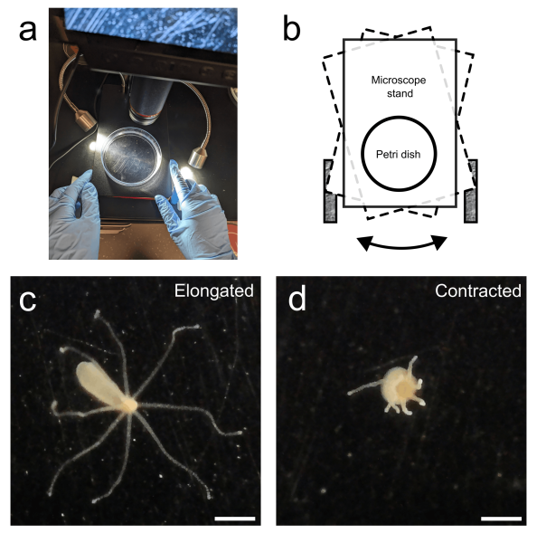 Students will measure changes in Hydra’s body shape in response to mechanical stimuli. The activity thereby explores how structure relates to function, a core concept from introductory biology, as well as how the nervous system senses external stimuli and triggers a behavioural response. This is achieved through hands-on experiments using a low-cost microscope and quantitative analysis.