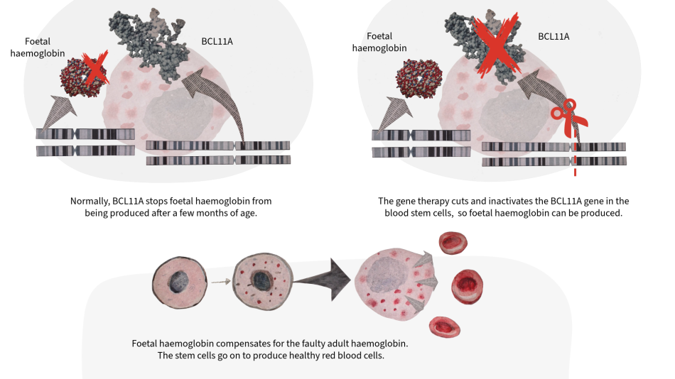 Humans have more than one type of haemoglobin. Foetal haemoglobin is only active during early stages of life and becomes dormant (inactive) when adult haemoglobin takes over. However, in people with SCD, the adult haemoglobin gene is faulty. To treat SCD with gene therapy, doctors target the BCL11A gene, which is responsible for switching off foetal haemoglobin. A technology called CRISPR-Cas9 is used to directly target and cut the BCL11A gene in patients’ blood stem cells, deactivating it. This means foetal haemoglobin is no longer suppressed and can compensate for the faulty adult haemoglobin.[6] Since blood stem cells also make our red blood cells, this treatment allows healthy red blood cells to be produced.