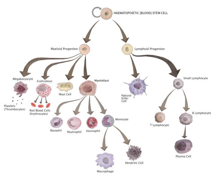 SCID is caused by mutations in genes that make proteins required for the white blood cells to function properly. White blood cells are normally produced by blood stem cells, which live in the bone marrow and produce all the different cell types that make up our blood.