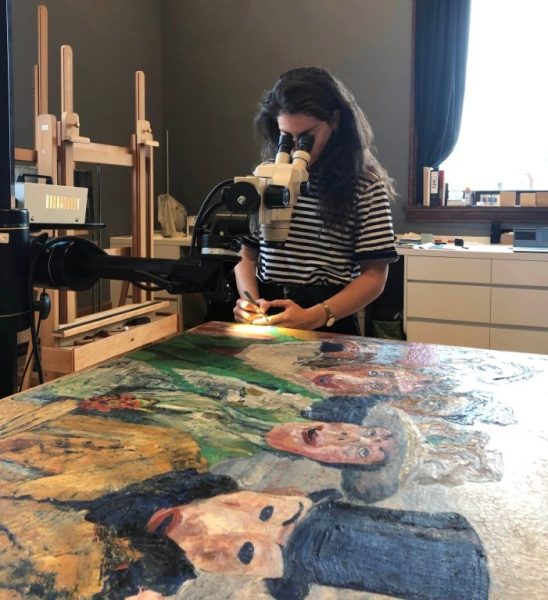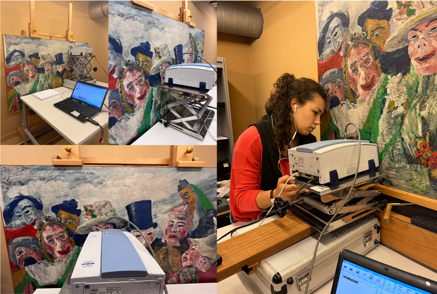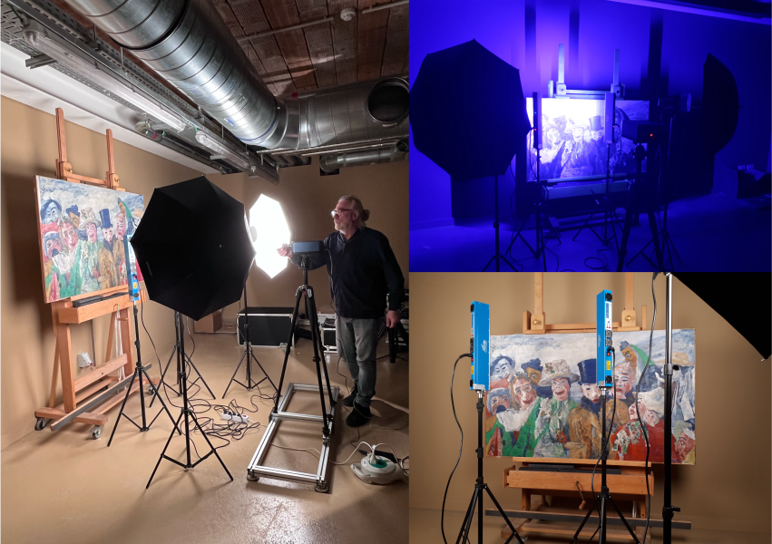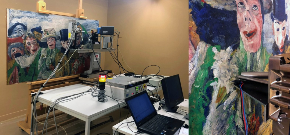 First, scientists performed non-invasive measurements directly on the painting. Using portable instruments provided by the University of Antwerp and the European mobile heritage science laboratory, MOLAB, they analysed the green areas without removing any material. These measurements helped them to identify where to take microscopic samples for further study.
