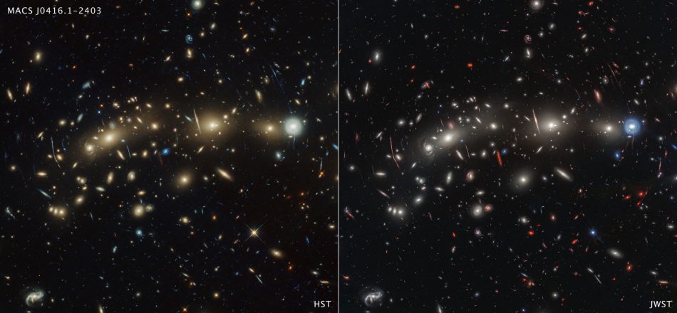The Hubble Space Telescope (HST) and the James Webb Space Telescope (JWST) were used to observe the MACS0416 galaxy cluster in the constellation Eridanus, which is over 4 billion light-years away. The JWST’s light-gathering area is approximately 5.6 times larger than that of the HST, enabling it to collect 5.6 times more photons in the same amount of time as the HST. To obtain the two almost identical images below, the JWST observed for 22 hours, while HST required 122 hours, which is 5.5 times longer than the JWST observation, as expected.[1]
