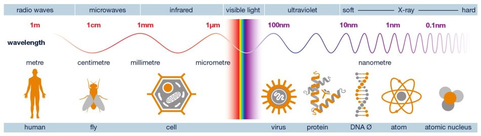 It may come as a surprise to learn that X-rays are a form of light, given that we can’t see them with our naked eyes. In physics, however, the term ‘light’ means more than just what we see. Ultraviolet light, for instance, is invisible, but we notice its existence when we get sunburnt. All types of light, including radio waves, microwaves as well as X-rays, belong to the same family: electromagnetic waves.[4]
