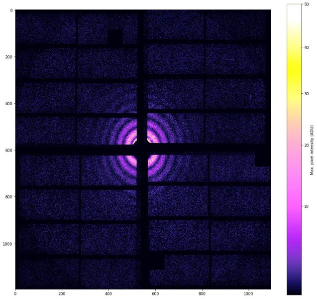 At European XFEL, scientists often don’t get a familiar picture at all. Instead, the detector records a diffraction pattern: a pattern of spots, rings, or speckles created when X‑rays scatter off a sample.[7] You wouldn’t see these effects in an X-ray of your bones, since they only appear when the scale of what is pictured is similar to the wavelength. For example, the distance between atoms in a molecule is roughly as wide as the wavelength of X-ray light.