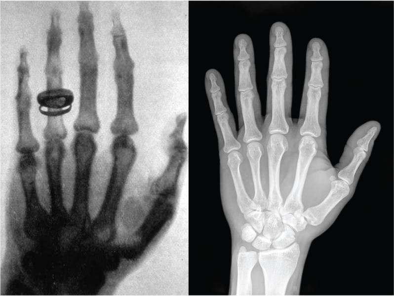 In 1895, the physicist Wilhelm Conrad Röntgen noticed a strange kind of radiation that could pass through paper and flesh, but not through bone. He called it X-radiation, because he didn’t know what it was.[1,2] Today, we still call it X-ray, although in some languages they are known as Röntgen light or Röntgen rays, and they are used every day in hospitals to make the inside of the body visible.
