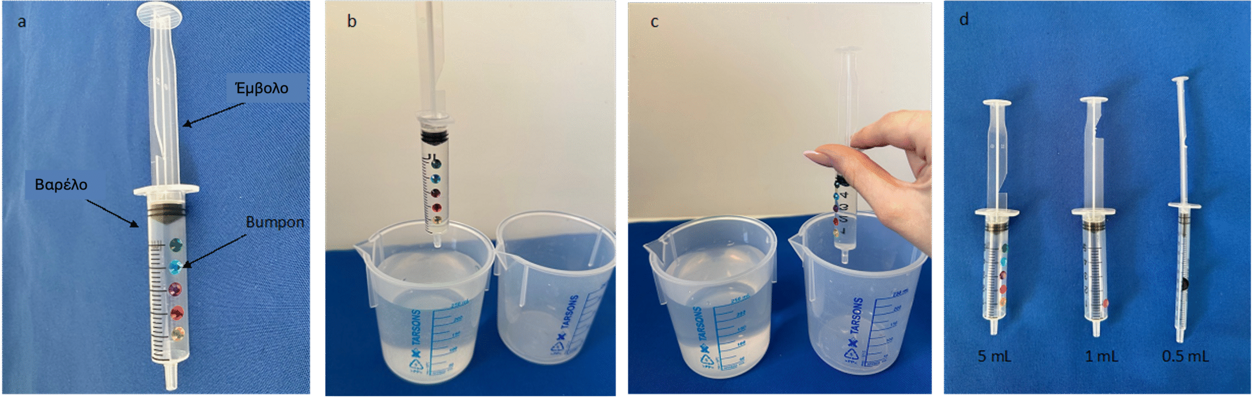 Εικόνα 2: α) Μια 5 mL σύριγγα τροποποιημένη κόβοντας μια εγκοπή σε ένα έμβολο τέτοιο ώστε ο πάτος του εμβόλου να είναι σε ευθεία με το πάνω μέρος του βαρελιού(κάννης) όταν υπάρχουν 5 mL μέσα στη σύριγγα. β) Μια σύριγγα γεμάτη. γ) Το υπολειπόμενο υγρό της σύριγγας όταν η εγκοπή είναι σε ευθεία με το βαρέλι (την κάννη) εναποτίθεται στο δοχείο αντίδρασης. δ) Σύριγγες με προβλεπόμενους όγκους των 5 mL, 1 mL, και 0,5 mL, τροποποιημένες με εγκοπές σε διαφορετικά μέρη του εμβόλου. Εικόνα ευγενική παραχώρηση των συγγραφέων.