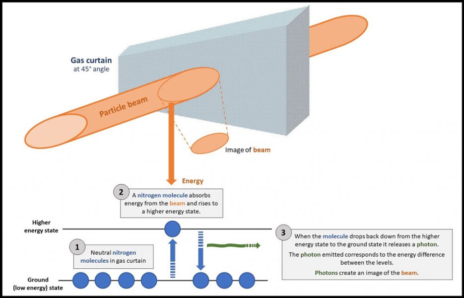 This gas curtain then interacts with the primary particle beam to be analyzed. The primary beam excites electrons in the gas molecules from the ground state to a higher energy level. Once the beam has passed, the electrons return to the ground state and photons of a precise wavelength are emitted. This fluorescence is detected and used to produce a two-dimensional image of the beam (see diagram 4).