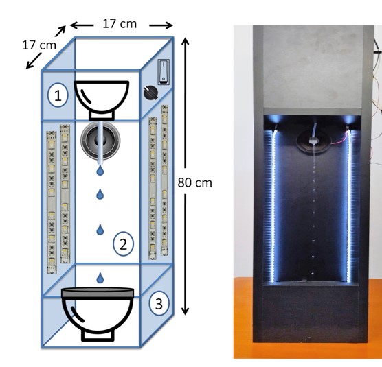 (fLED = fsound = 50 Hz), every time a drop comes out of the tube, the LEDs light up. So, every time the LEDs light up, we take the same snapshot and the drops will appear motionless. When the flash frequency of the LEDs is slightly lower than the frequency of sound, the drops appear to be moving downwards, whereas, when the flash frequency of the LEDs is slightly higher than the frequency of sound, the drops seem to be moving upwards.