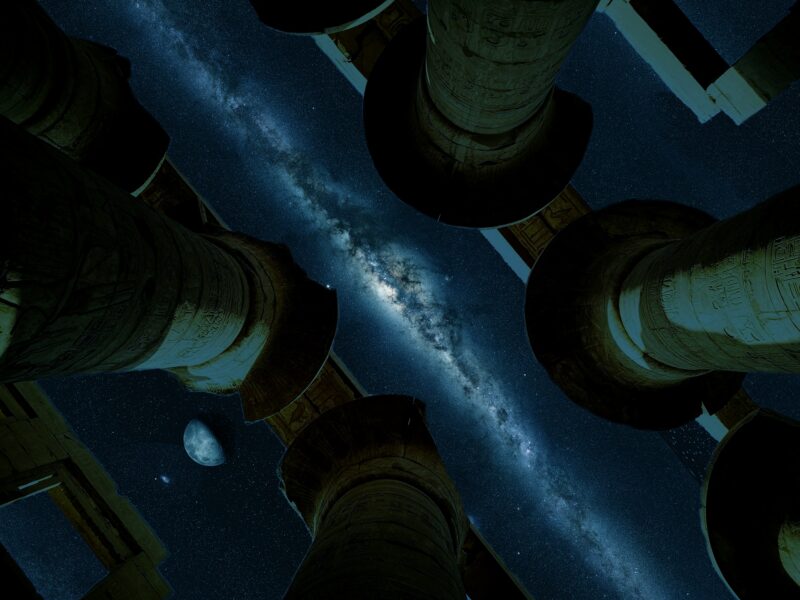 Secondly, the brightest part of the Milky Way never crosses the sky directly overhead at Karnak. Our galaxy is a swarm of billions of stars arranged in a flat disc and a dense bright centre, similar to a fried egg. We’re located in the outskirts of the disc, and due to the way the Earth is oriented in space, the centre of the Milky Way appears higher up in the sky in the southern hemisphere than in the northern one. More precisely, the centre can only be seen directly overhead from locations at a latitude of around 29° south, as seen in this image taken from ESO’s La Silla Observatory.
